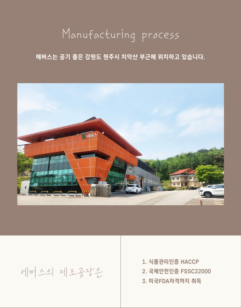 | 생산자 및 소재지 | (주)에버스 / 강원도 원주시 소초면 현촌길108 | 제조연월일, 소비기한 또는 품질유지기한 | 상시제조, 제조일로부터 18개월 |