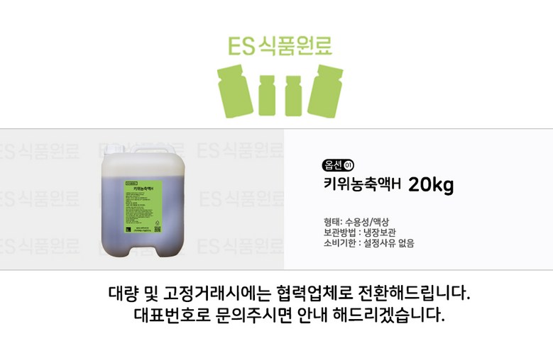 | 포장단위별 내용물의 용량(중량), 수량 | 20kg | 원재료명 및 함량 | 키위농축액(뉴질랜드산/키위 100%) 100% |