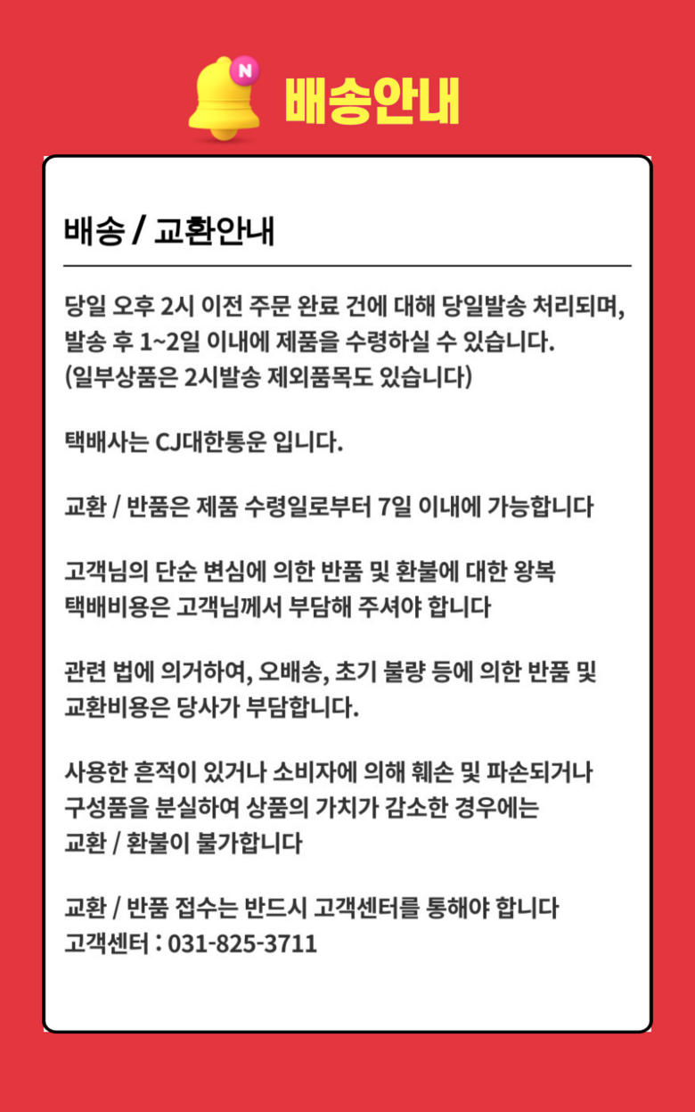 - ㆍ모니터 해상도의 차이로 인해 색상이나 이미지가 실제와 달라, 고객이 단순 변심으로 교환/반품을 무료로 요청하는 경우
