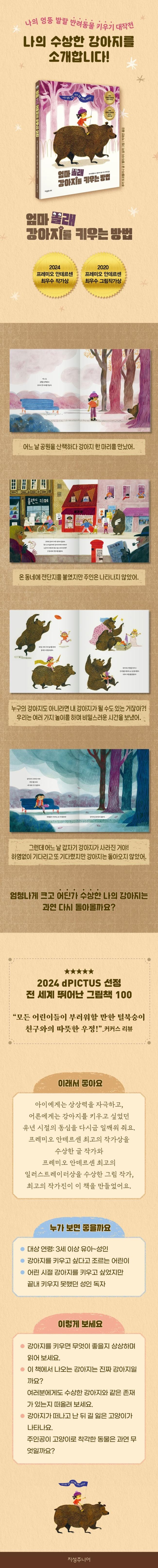 간절한 마음이 만들어낸 기발하고 엉뚱한 상상력의 세계 여러분의 마음에는 어떤 강아지가 있나요? 강아지를 키우는 게 소원이었던 나는 길에서 우연히 길 잃은 강아지를 마주쳐요. 신이 난 나머지 강아지를 집으로 데려가서 마당 구석에 집을 지어주고 먹을 것을 줘요. 물론 부모님께는 비밀이에요! 부모님은 강아지를 좋아하지 않으시니까요. 변장 놀이를 하고 간지럼을 태우고 온종일 놀아도 강아지는 도무지 지칠 줄을 몰랐어요. 정말 꿈에 그리던 친구였지요. 그런데 문득 누군가 잃어버린 강아지일 수도 있다는 생각이 들었어요. 부랴부랴 온 동네에 “강아지 주인을 찾습니다!”라는 전단지를 붙였어요. 만나는 모든 사람에게 물어보고 혹시나 하는 마음에 분실물 보관소까지 가 보았지만 주인은 나타나지 않았어요. 누구의 강아지도 아니라면 내 강아지가 될 수도 있다는 생각에 마음 놓고 즐거운 일상을 즐겨요. 엄청나게 크고 어딘가 수상한 강아지와 함께 다니기 시작하니 뒷골목의 못된 언니 오빠들은 더 이상 나를 괴롭히지 않았어요. 버스 뒷자리에서 시끄럽게 소리를 질러 대던 아이들도 조용해졌어요. 이웃집 개들이 길에서 나를 보고 짖어 대며 쫓아오는 일도 없고, 잠들기 전 어둠이 무섭지도 않았어요. 동네 곳곳을 산책하고 때론 아주 멀리 가 보기도 했지요. 그런데 어느 날 강아지가 갑자기 사라졌어요! 나를 든든하게 지켜주고 친구처럼 즐겁게 해 주었던 강아지가 사라진 거예요. 그렇게 매일을 엉엉 울면서 보내는데… 떠나버린 강아지는 과연 다시 돌아올까요? “모든 어린이들이 부러워할 만한 털북숭이 친구와의 따뜻한 우정” 2024 dPICTUS 선정 전 세계 뛰어난 그림책 100 누구나 한 번쯤 어린 시절에는 강아지를 키우고 싶다는 간절한 바람을 품어요. 외로운 마음을 달래줄 강아지와 뛰어노는 상상으로 부모님을 조르지만 웬일인지 부모님은 완강하게 반대하곤 했죠. 부모님의 반대에도 불구하고 길 잃은 강아지를 집으로 데려와서 키우는 『엄마 몰래 강아지를 키우는 방법』 속 주인공의 일상을 따라가 보세요. 어른은 유년 시절에 순수했던 동심을 다시 마주하게 되고, 아이의 마음에는 서운하고 토라진 마음이 사라지고 기발하고 엉뚱한 상상력이 가득 차게 될 거예요. 지금 떠올려 보세요. 여러분은 어떤 강아지를 키우고 싶었나요? 엄청나게 커서 품에 폭 안길 수 있는 강아지였나요, 아주 작고 귀여워서 주머니에 쏙 넣을 수 있는 강아지였나요? 그 강아지와 무엇을 함께하고 싶었나요? 프레미오 안데르센 최고의 작가상을 수상한 최고의 작가진이 모여 탄생한 엉뚱 발랄한 그림책! 『엄마 몰래 강아지를 키우는 방법』은 이탈리아 대표 아동 문학상인 프레미오 안데르센 ‘최고의 작가상’과 ‘최고의 그림작가상’을 수상한 두 작가가 모여 탄생했어요. 이 책을 보고 커커스 리뷰는 “모든 어린이들이 부러워할 만한 털북숭이 친구와의 따뜻한 우정”을 그린 책이라고 말했죠. 또한 세계적인 그림책 출판사들이 모인 영국 플랫폼인 dPICTUS는 2024년 전 세계 뛰어난 그림책 100선에 이 책을 꼽기도 했답니다. 자, 이제 그럼 친근하고 기발한 상상력이 가득한 『엄마 몰래 강아지를 키우는 방법』 속으로 함께 떠나볼까요? 과연 주인공이 데려온 길 잃은 강아지는 진짜 강아지가 맞을까요? 주인공을 갑자기 떠나버린 강아지는 결국 다시 돌아올까요? 강아지가 떠나고 위로해주듯 찾아온 고양이는 정말 고양이가 맞을까요?!
