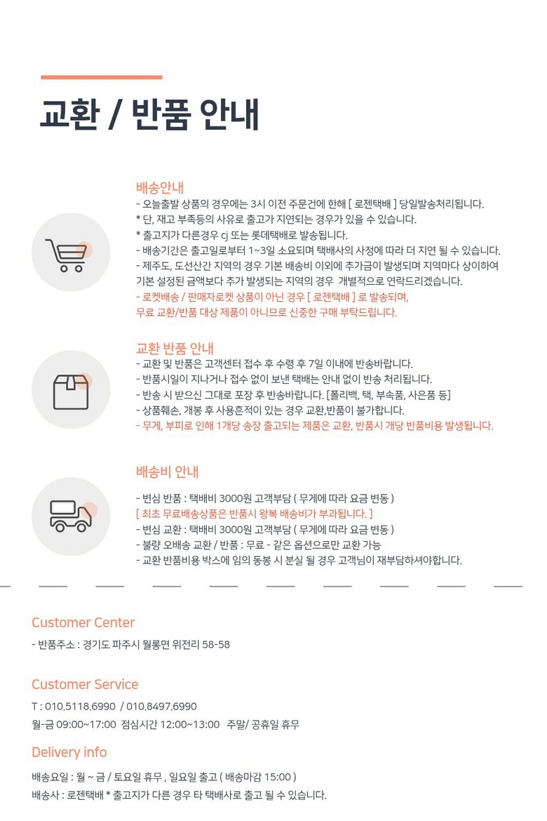 - ㆍ모니터 해상도의 차이로 인해 색상이나 이미지가 실제와 달라, 고객이 단순 변심으로 교환/반품을 무료로 요청하는 경우