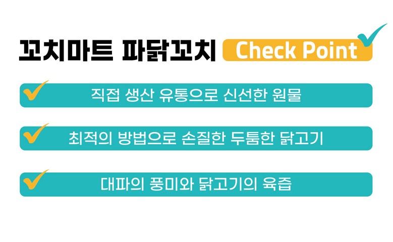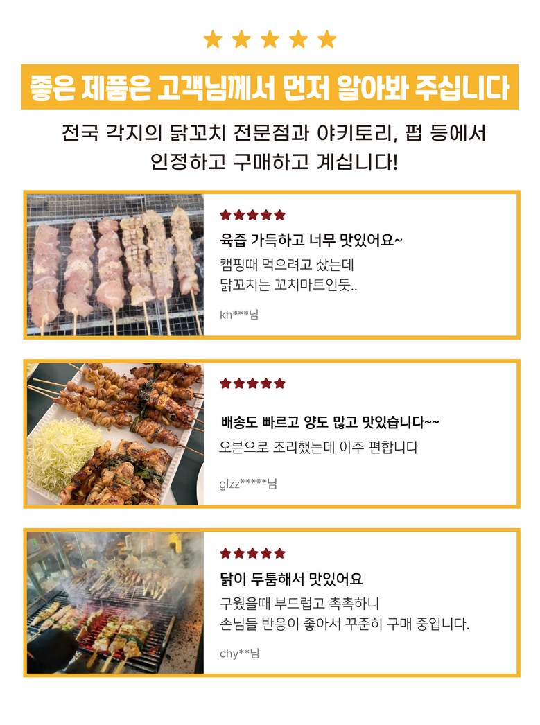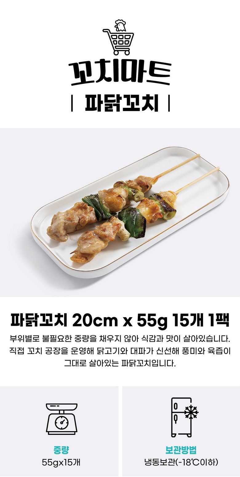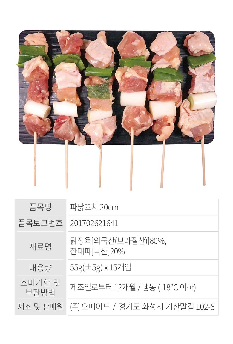 | 품목 또는 명칭 | 파닭꼬치 20cm | 포장단위별 내용물의 용량(중량),수량,크기 | 55g x 15개 1팩 |