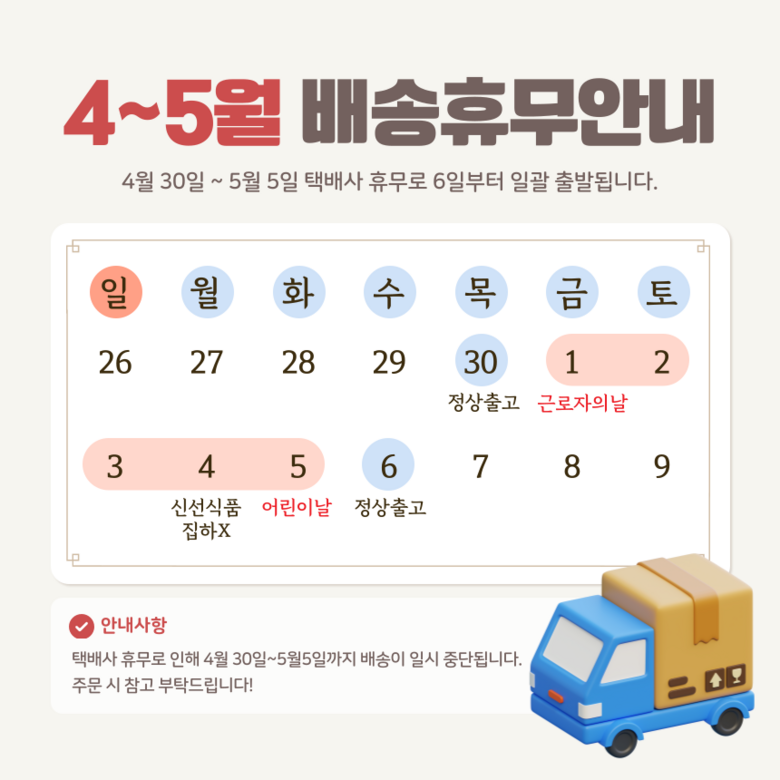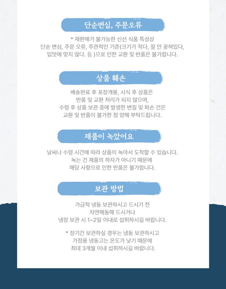 - ㆍ모니터 해상도의 차이로 인해 색상이나 이미지가 실제와 달라, 고객이 단순 변심으로 교환/반품을 무료로 요청하는 경우
