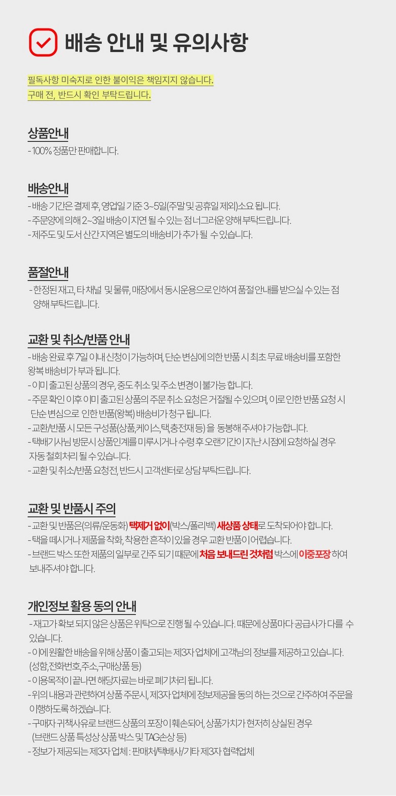 - ㆍ모니터 해상도의 차이로 인해 색상이나 이미지가 실제와 달라, 고객이 단순 변심으로 교환/반품을 무료로 요청하는 경우