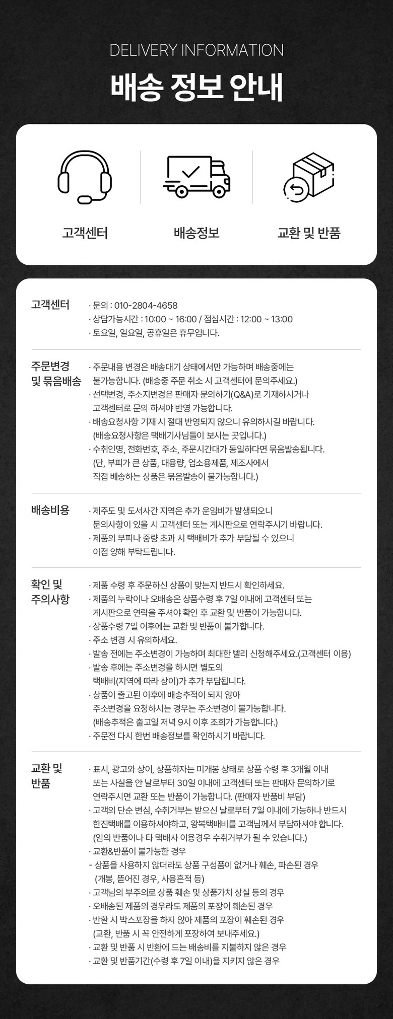 | 교환/반품 신청 기준일 | ㆍ단순변심에 의한 교환/반품은 제품 수령 후 7일 이내까지, 교환/반품 제한사항에 해당하지 않는 경우에만 가능 (배송비용과 교환/반품 비용 왕복배송비 고객부담) ㆍ상품의 내용이 표시·광고의 내용과 다른 경우에는 상품을 수령한 날부터 3개월 이내, 그 사실을 안 날 또는 알 수 있었던 날부터 |