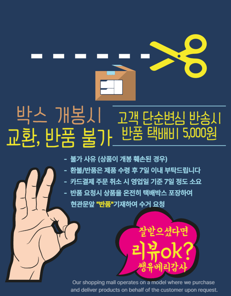 - ㆍ모니터 해상도의 차이로 인해 색상이나 이미지가 실제와 달라, 고객이 단순 변심으로 교환/반품을 무료로 요청하는 경우