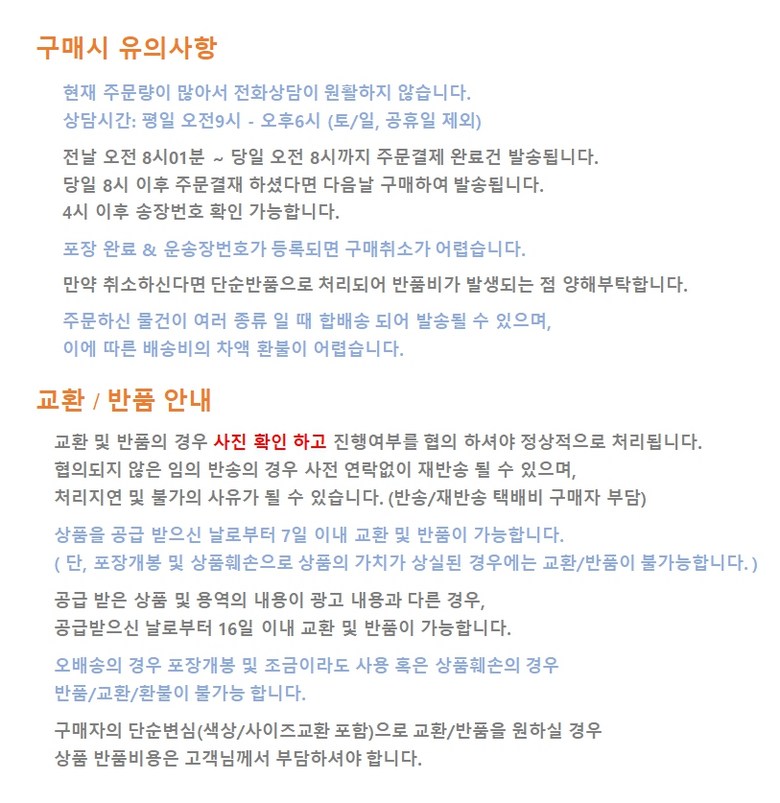 - ㆍ교환/반품에 관한 일반적인 사항은 판매자가 제시사항보다 관계법령이 우선합니다.