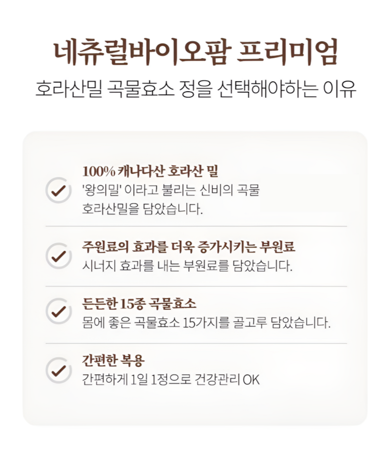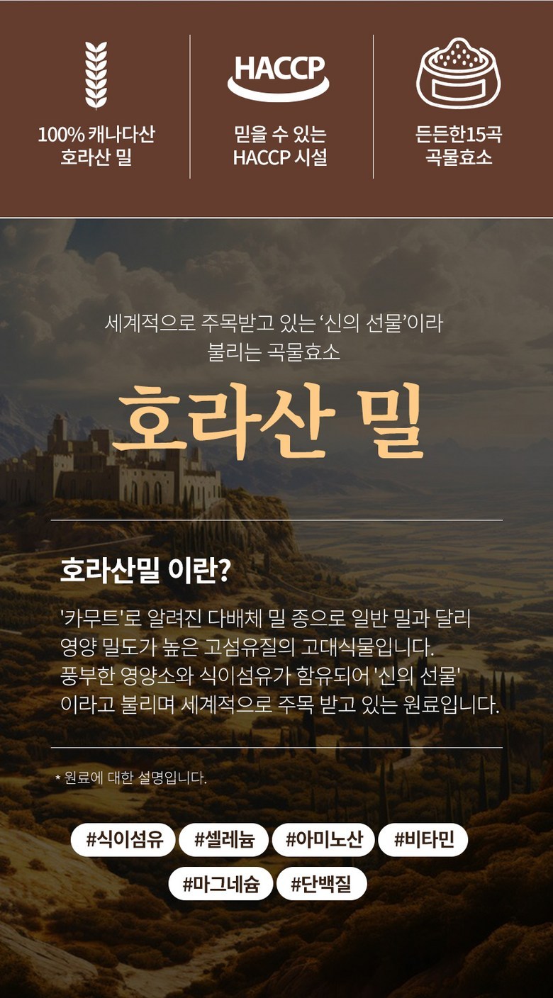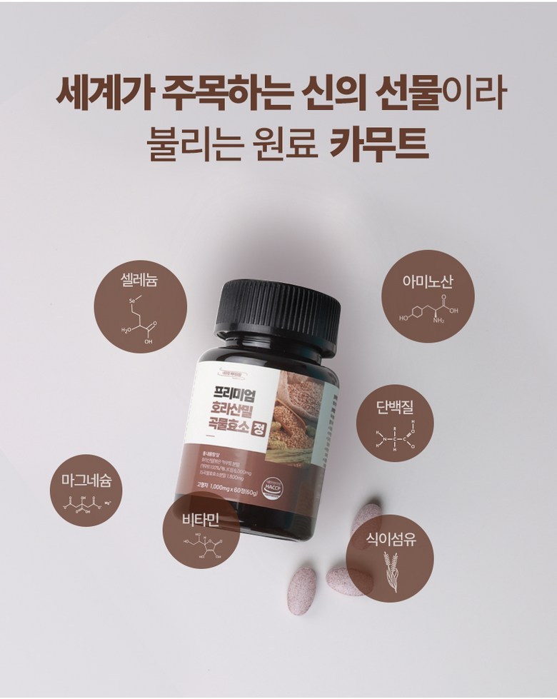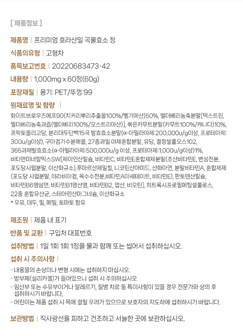 | 제품명 | 프리미엄 호라산밀 곡물효소정 | 식품의 유형 | 고형차 |