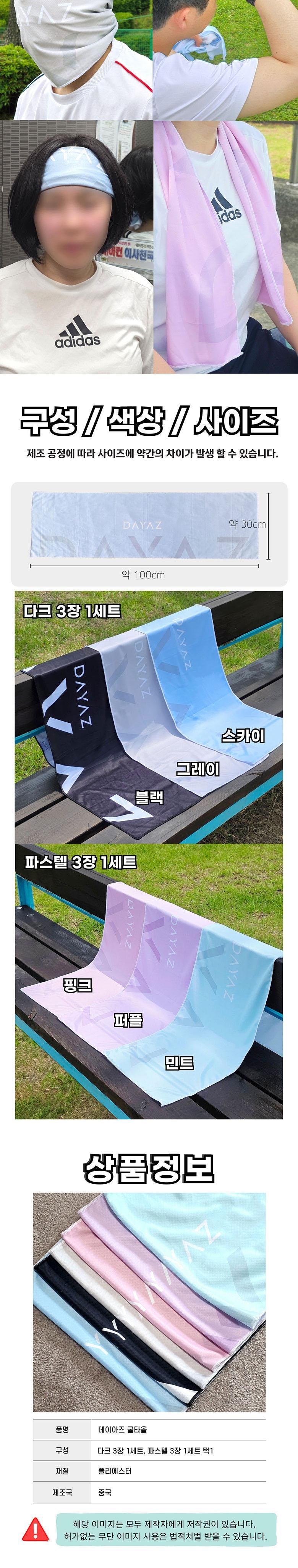 | 품명 및 모델명 | 데이아즈 쿨타올 3장 세트 | KC 인증정보 | 상품 상세페이지 참조 |