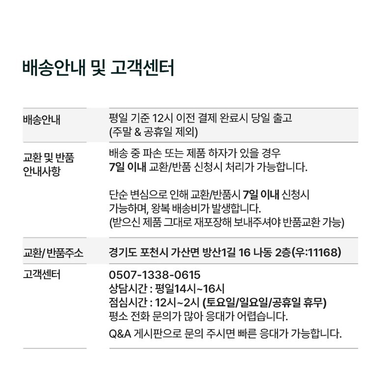 | 소비자상담 및 교환반품 문의 | 쿠팡고객센터 1577-7011 배송 및 환불/교환에 대한 문의는 마이쿠팡-고객센터 내 상담하기를 이용해주세요. | ||