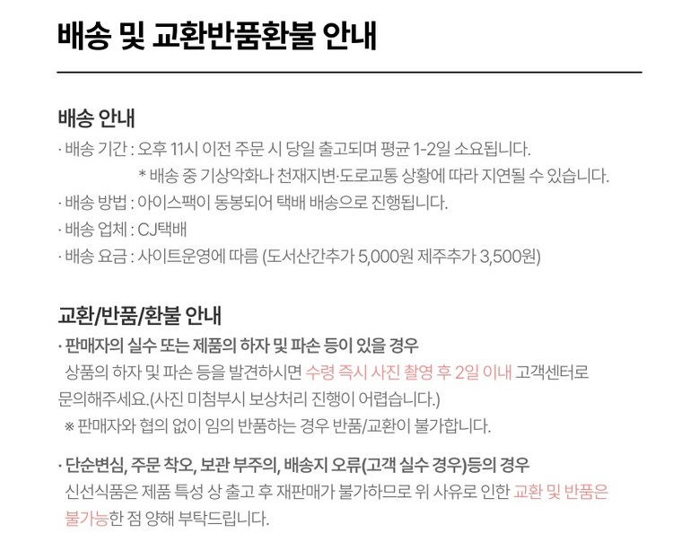 | 배송방법 | 신선/냉장/냉동 | 배송비 | 무료배송 · 도서산간 추가 배송비 - 제주 지역: 3,500원 - 도서산간 지역: 5,000원 |