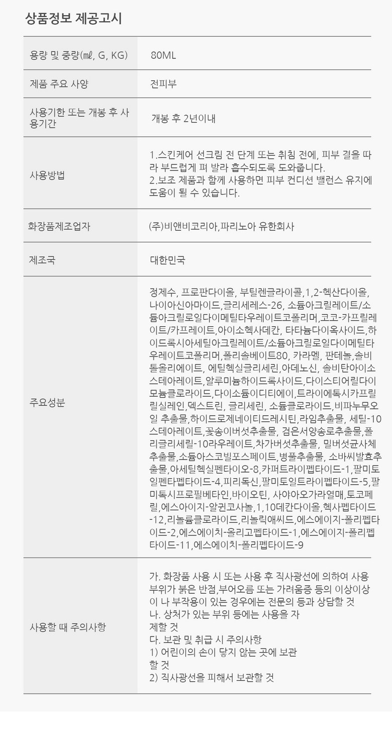 | 용량(중량) | 80ml | 제품 주요 사양 | 모든피부 |