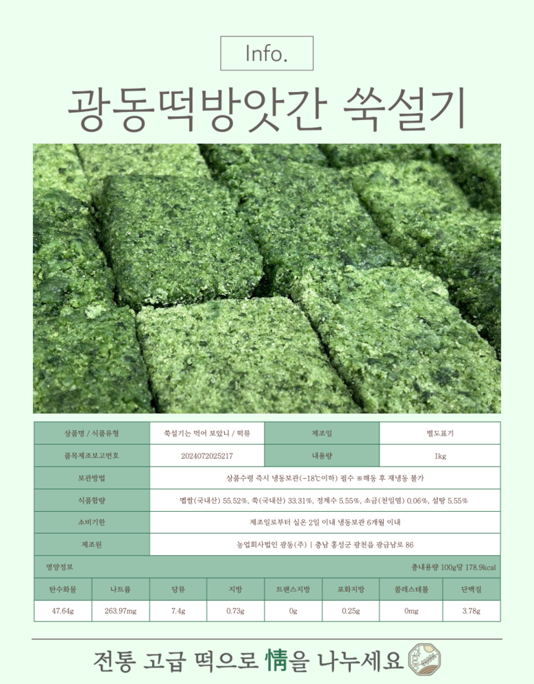 상호/대표자 | 광동떡집 / 이현주 | 사업장 소재지 | 충청남도 홍성군 광천읍 홍남로 712 광동떡방앗간 |