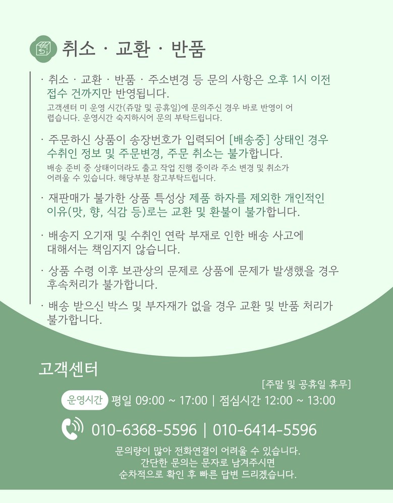 - 상품문의 및 후기게시판을 통해 취소나 환불, 반품 등은 처리되지 않습니다.