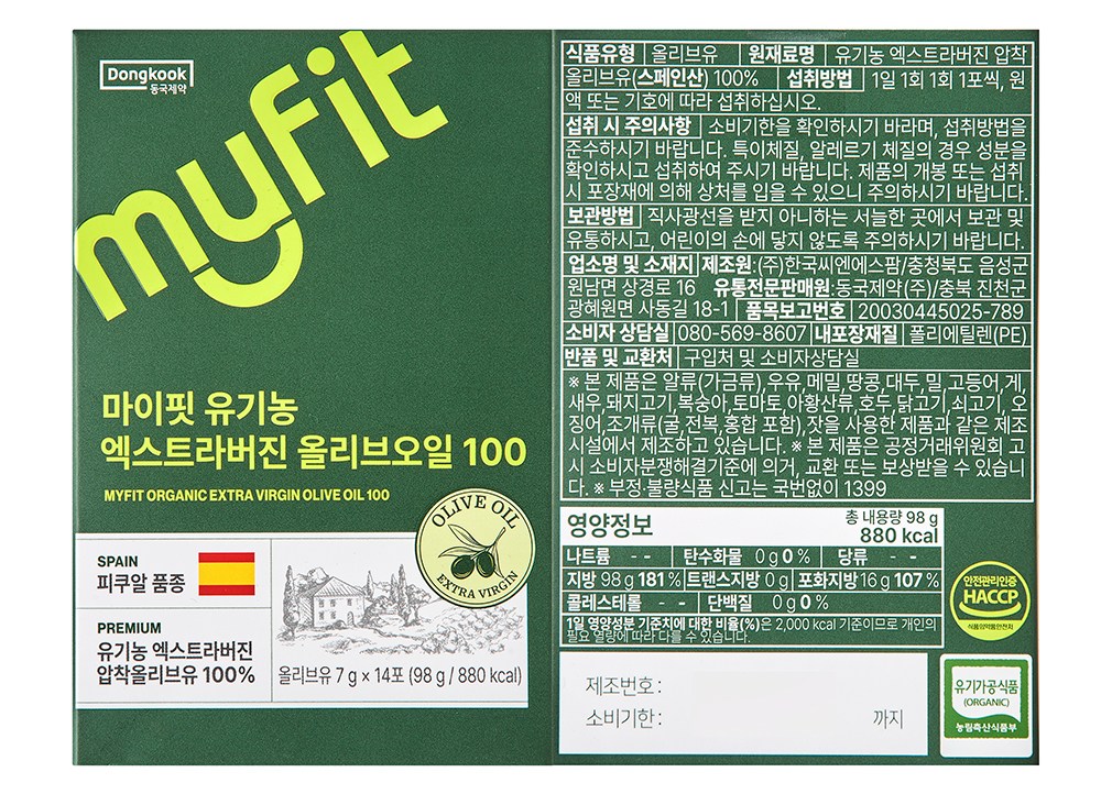 | 제품명 | 마이핏 유기농 엑스트라버진 올리브오일 100 | 식품의 유형 | 올리브유 |