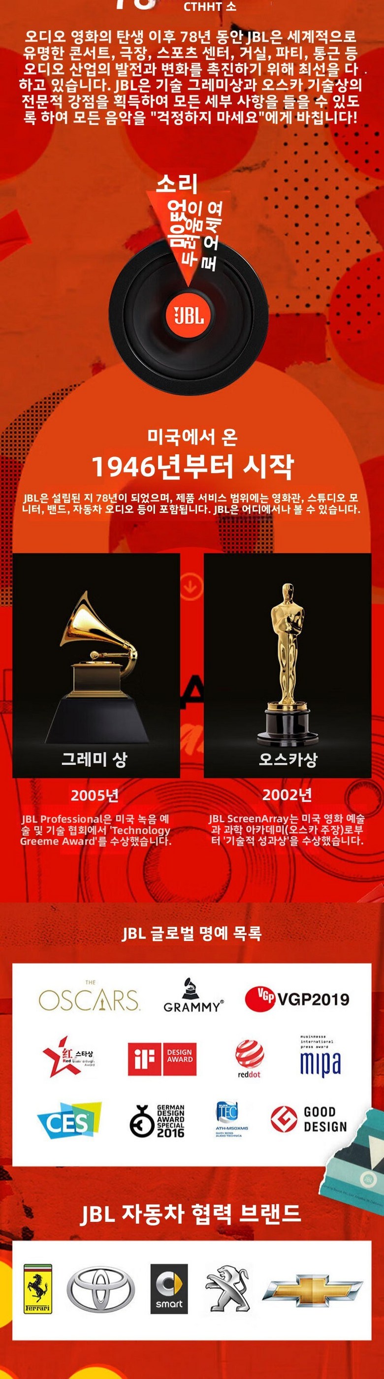 JBL의 설립자인 James.B.Lansing은 1920년부터 스피커 기술 개발에 힘써왔고, 1946년에 JBL을 창업했습니다. 이후 하만 인터내셔널이 구축한 글로벌 네트워크를 기반으로 고객들을 확보하며 세력을 확장할 수 있었고, 1980년대부터 고성능의 스피커로 판매 실적을 높이며 강세를 보이고 있는 브랜드입니다.