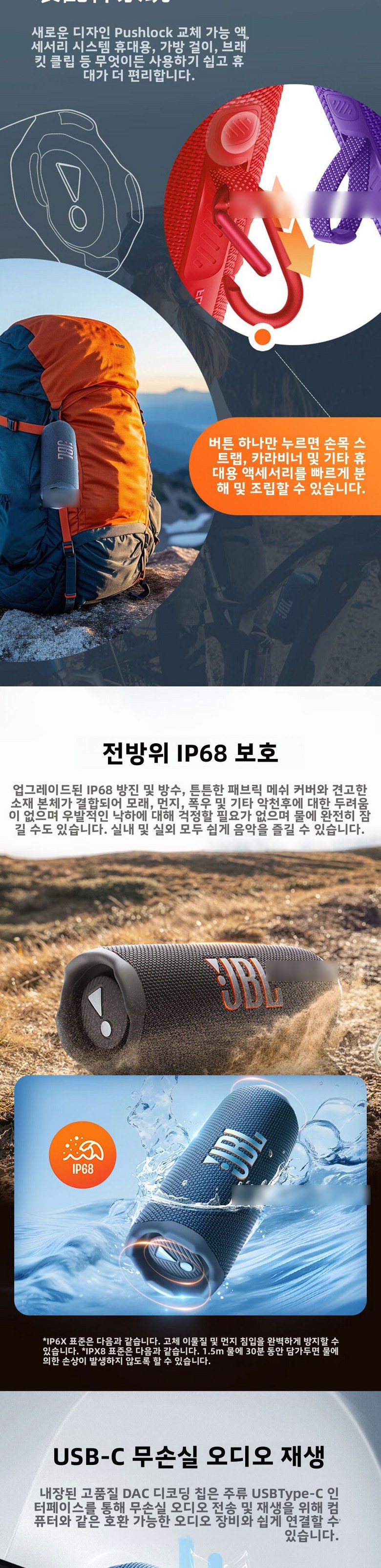 완전히 새로워진 퀵 릴리즈 조립 시스템이 탑재되었습니다. 전 방향 IP68 등급 방수를 지원합니다. 원클릭 CP 연결로 더욱 입체적인 사운드를 구현할 수 있습니다. USB-C 무손실 오디오 재생을 지원합니다. 확장 기능을 한 화면에서 간편하게 설정할 수 있습니다. 휴대용 충전으로 효율적인 장시간 사용이 가능합니다.