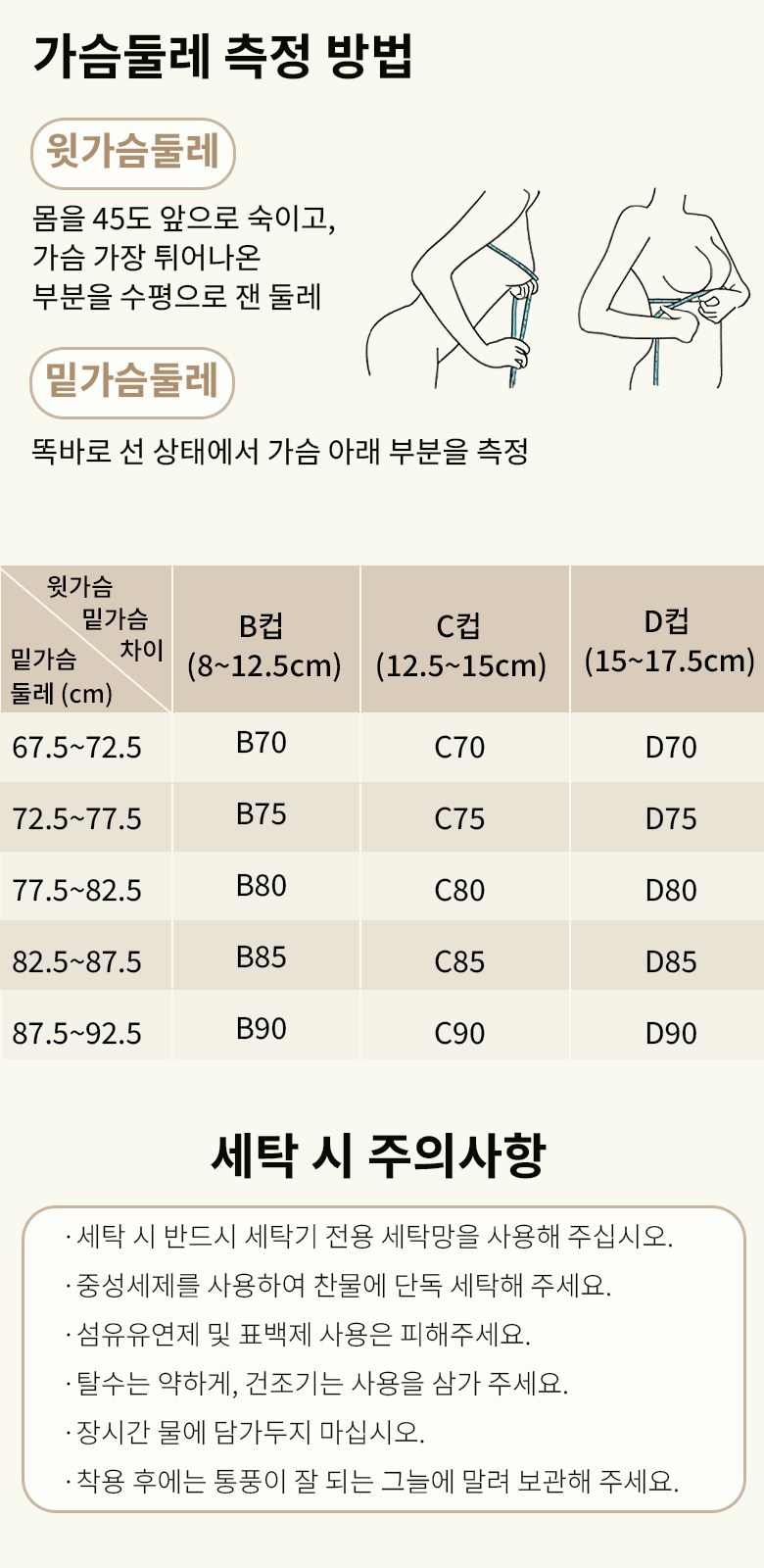 | 제조국 | 중국 | 세탁방법 및 취급시 주의사항 | 1.세탁기 사용이 가능합니다.2.전용 속옷 세탁망에 넣어서 세탁해 주세요.3.미지근한 물에 중성세제 사용을 권장합니다.4.삶거나 표백제 사용은 피해주세요.5.건조기 사용 시 제품 변형의 우려가 있습니다.6.직사광선을 피해 그늘에서 건조해 주세요. |