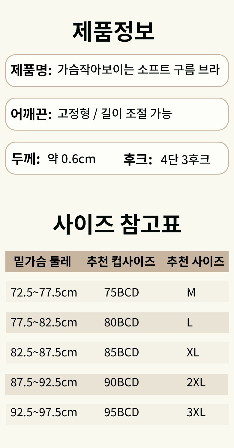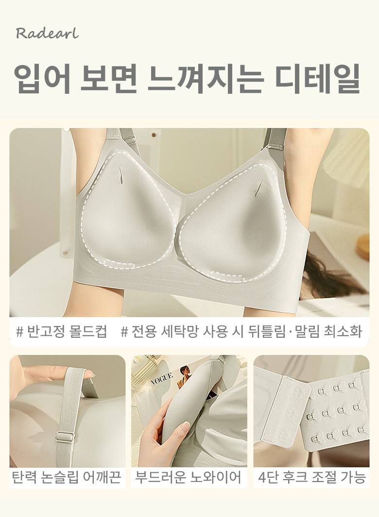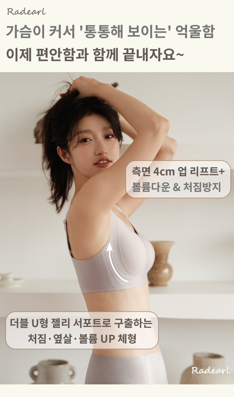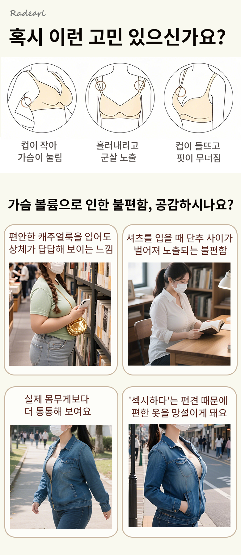 | 치수 | M 사이즈 – 34/75 BCD컵 추천; L 사이즈 – 36/80 BCD컵 추천; XL 사이즈 – 38/85 BCD컵 추천; XXL 사이즈 – 40/90 BCD컵 추천; XXXL 사이즈 – 42/95 BCD컵 추천 | 제조자(수입자) | Radearl |
