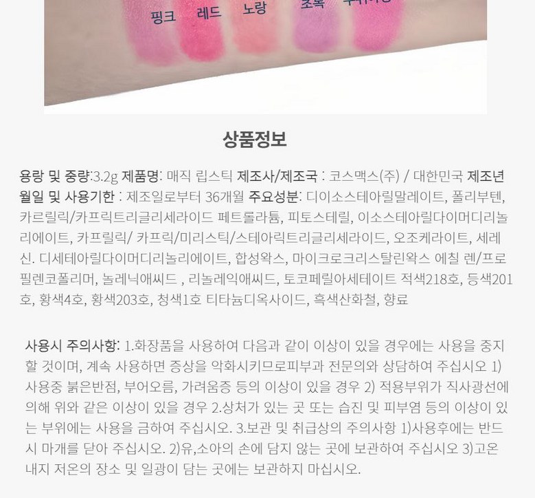 | 화장품제조업자, 화장품책임판매업자 및 맞춤형화장품판매업자 | 상품 상세페이지 참조 | 제조국 | 상품 상세페이지 참조 |