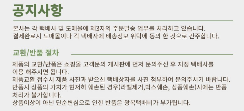 - ㆍ모니터 해상도의 차이로 인해 색상이나 이미지가 실제와 달라, 고객이 단순 변심으로 교환/반품을 무료로 요청하는 경우