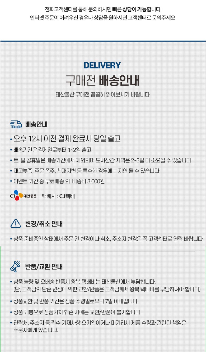 | 배송기간 | ㆍ도서산간 지역 등은 배송에 3-5일이 더 소요될 수 있습니다. - 천재지변, 물량 수급 변동 등 예외적인 사유 발생 시, 다소 지연될 수 있는 점 양해 부탁드립니다. | ||