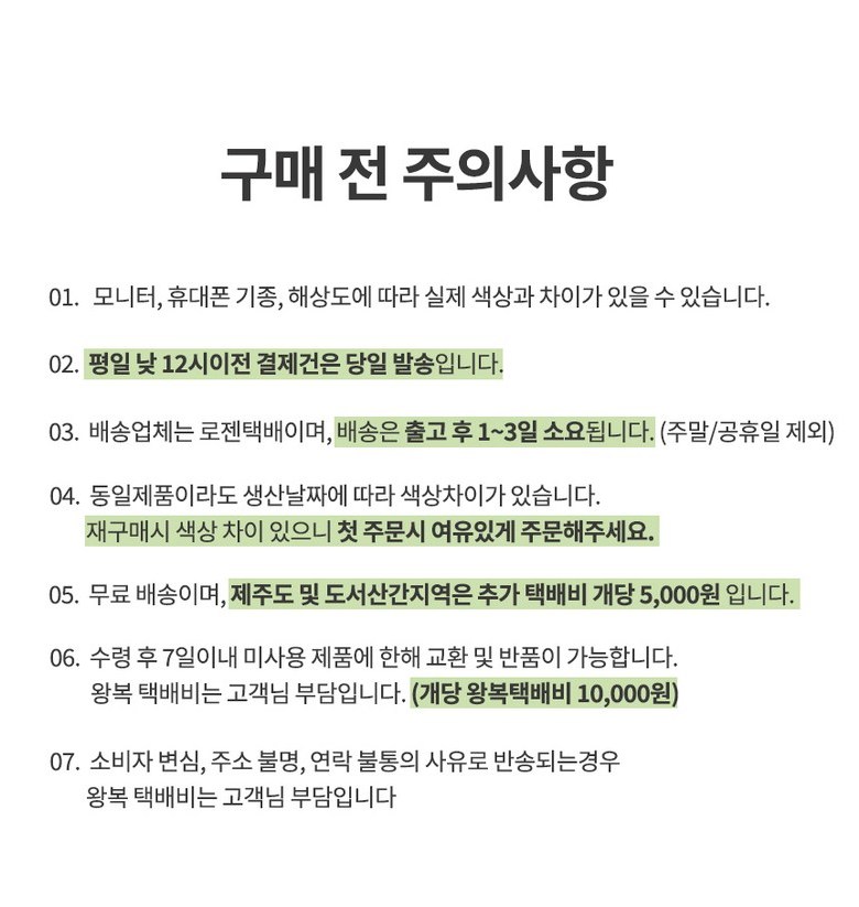 - ㆍ모니터 해상도의 차이로 인해 색상이나 이미지가 실제와 달라, 고객이 단순 변심으로 교환/반품을 무료로 요청하는 경우