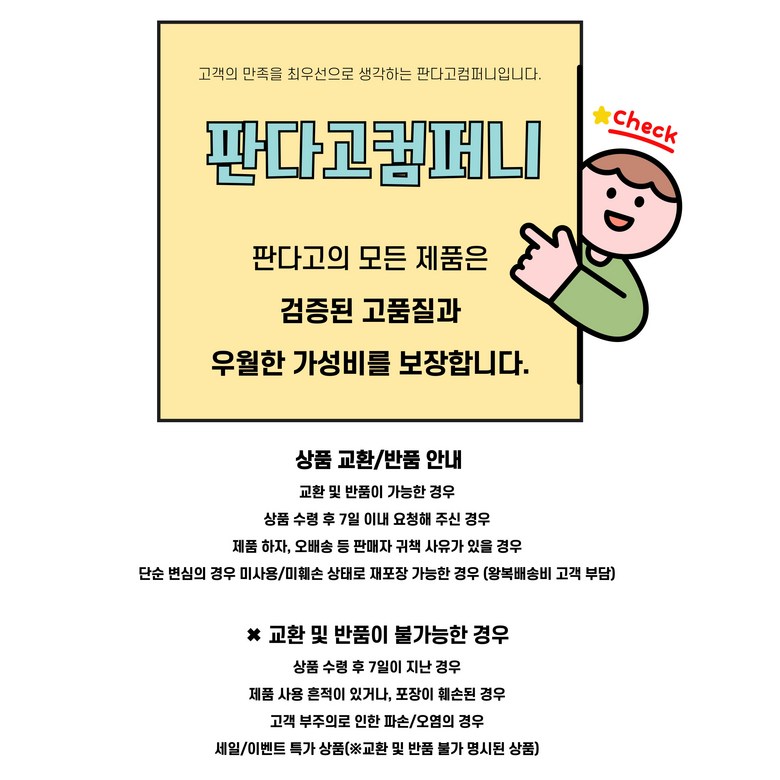 - ㆍ교환/반품에 관한 일반적인 사항은 판매자가 제시사항보다 관계법령이 우선합니다.