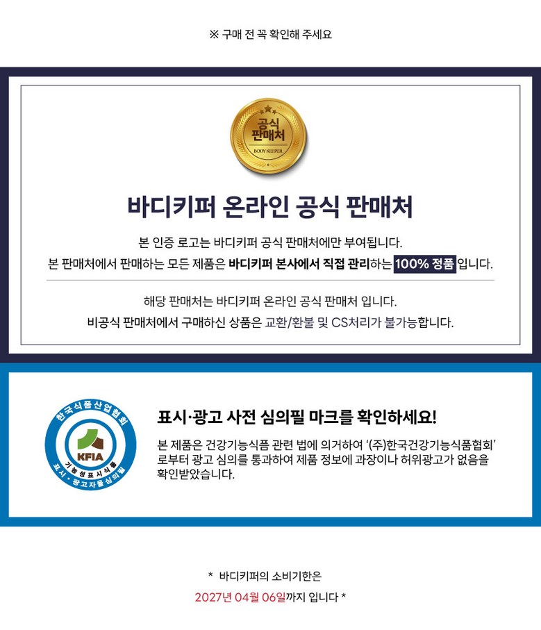 | 소비기한 및 보관방법 | 상품 상세페이지 참조 | 포장단위별 내용물의 용량(중량), 수량 | 상품 상세페이지 참조 |