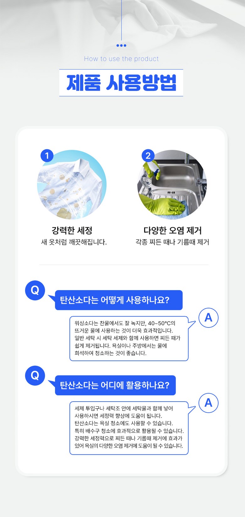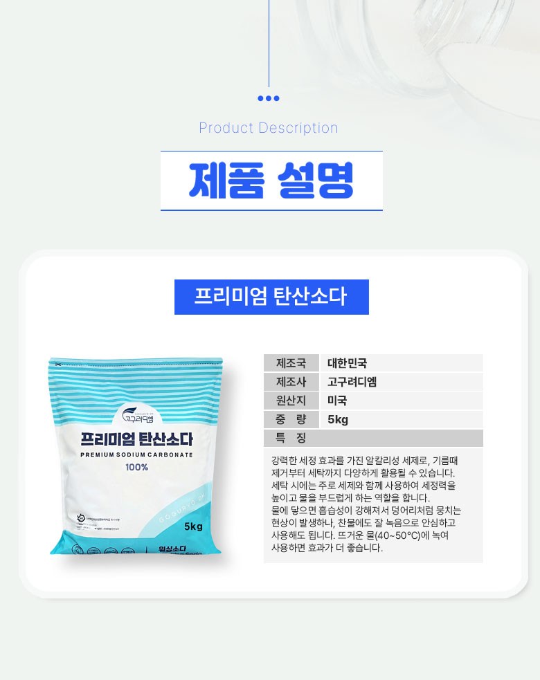 | 품목 및 제품명 | 세탁세제 / 프리미엄 탄산소다 | 용도(표백제의 경우 계열을 함께표시) 및 제형 | 섬유용 / 분사형- 보충형(분무기형) 비분사형-분말형 |
