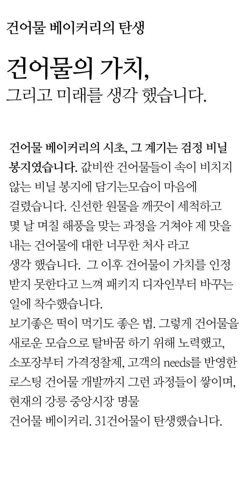 | 생산자 및 소재지 | 31건어물 (강원도 삼척시 미로면 동안로 98) | 제조연월일, 소비기한 또는 품질유지기한 | 제조연월일: 주문일로부터 3개월 이내 제조 상품 발송, 품질유지기한: 제조일로부터 24개월 |