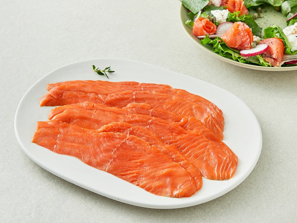 전통 참나무 훈연법으로 훈제해 비린 맛은 잡고 진한 풍미는 살린 연어예요. 연어 본연의 고소함과 부드러운 식감이 일품이죠. 얇게 슬라이스되어 있어 번거로운 과정 없이 바로 즐길 수 있답니다. 와인에 곁들여 안주로 즐기시거나 샌드위치 재료로 활용하셔도 좋아요.