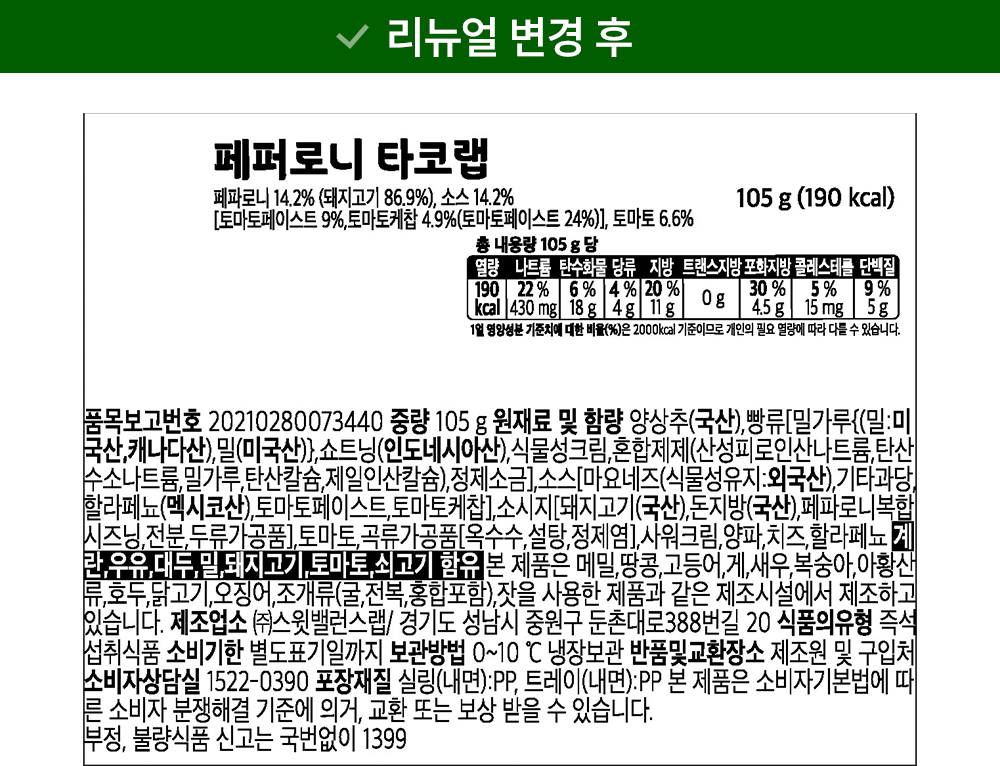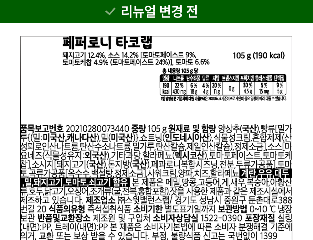 | 제품명 | 페퍼로니 타코랩 | 식품의 유형 | 컨텐츠 참조 |