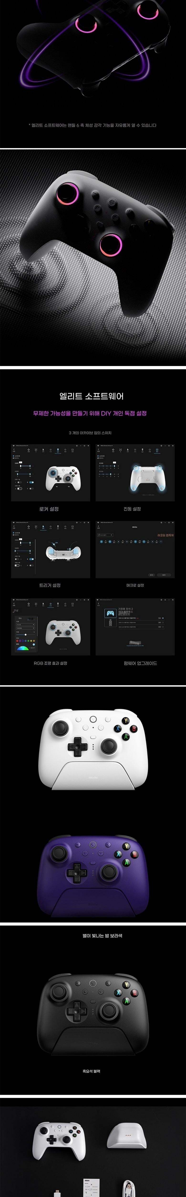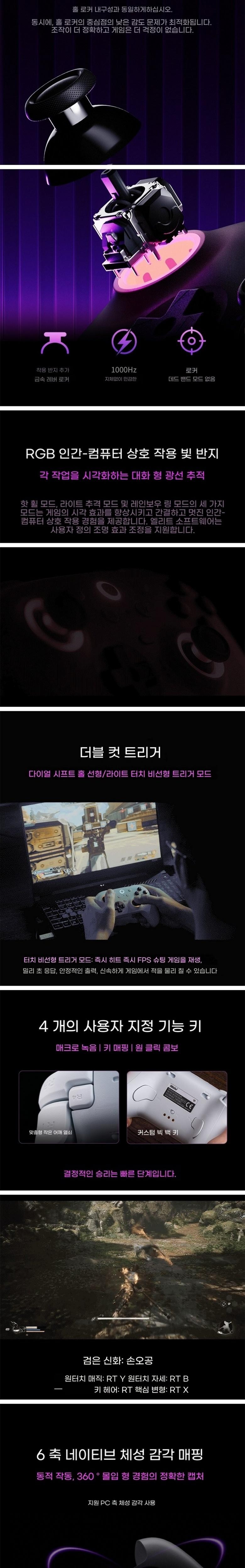 RGB 인터랙티브 조명 링, 3가지 모드 (불꽃, 추적, 무지개)로 조작을 시각화해 몰입감 있는 게임 경험을 제공합니다. 6축 센서로 움직임을 정밍하게 감지, 360° 몰입 체험을 제공합니다. 자동 충전 거치대에 놓으면 충전되고 바로 사용할 수 있습니다.
