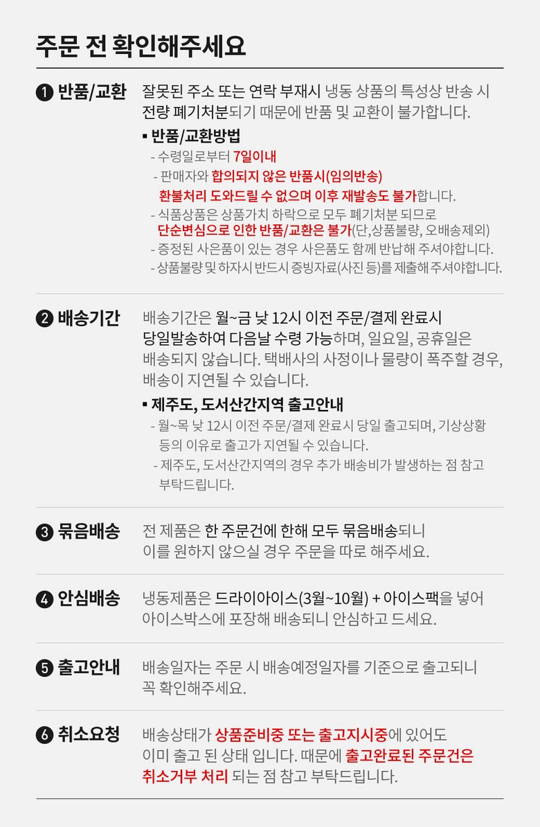 | 배송방법 | 신선/냉장/냉동 | 배송비 | 무료배송 · 도서산간 추가 배송비 - 제주 지역: 1,500원 - 도서산간 지역: 1,500원 |