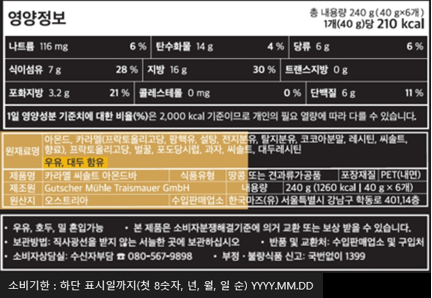 | 생산자 및 소재지 | 컨텐츠 참조 | 제조연월일, 소비기한 또는 품질유지기한 | 소비기한(또는 유통기한) : 2026년 08월 12일 이거나 그 이후인 상품 제조년월일 : 2025년 05월 20일 이후인 제조상품 |