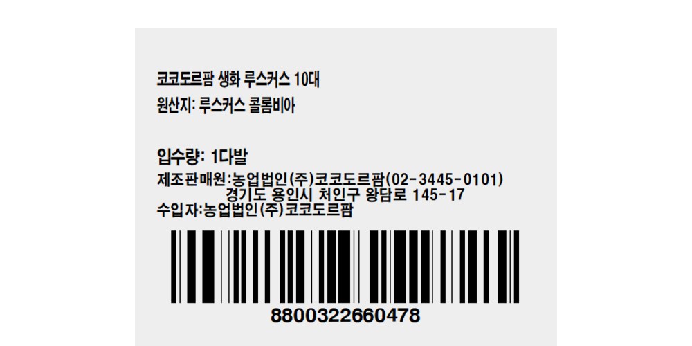 | 품명 및 모델명 | 코코도르팜 생화 루스커스 10대 | 인증/허가 사항 | 해당없음 |