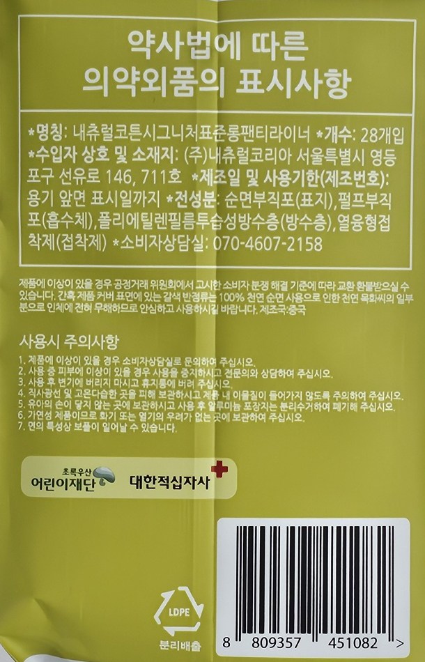 | 품명 및 모델명 | 내츄럴코튼시그니처표준롱라이너 | 인증/허가 사항 | 의약외품 |
