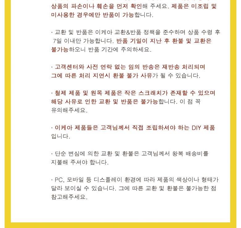 - ㆍ모니터 해상도의 차이로 인해 색상이나 이미지가 실제와 달라, 고객이 단순 변심으로 교환/반품을 무료로 요청하는 경우