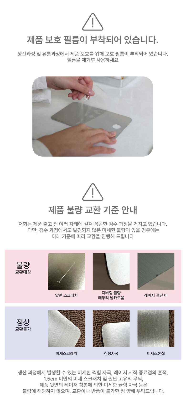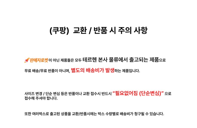 - ㆍ모니터 해상도의 차이로 인해 색상이나 이미지가 실제와 달라, 고객이 단순 변심으로 교환/반품을 무료로 요청하는 경우