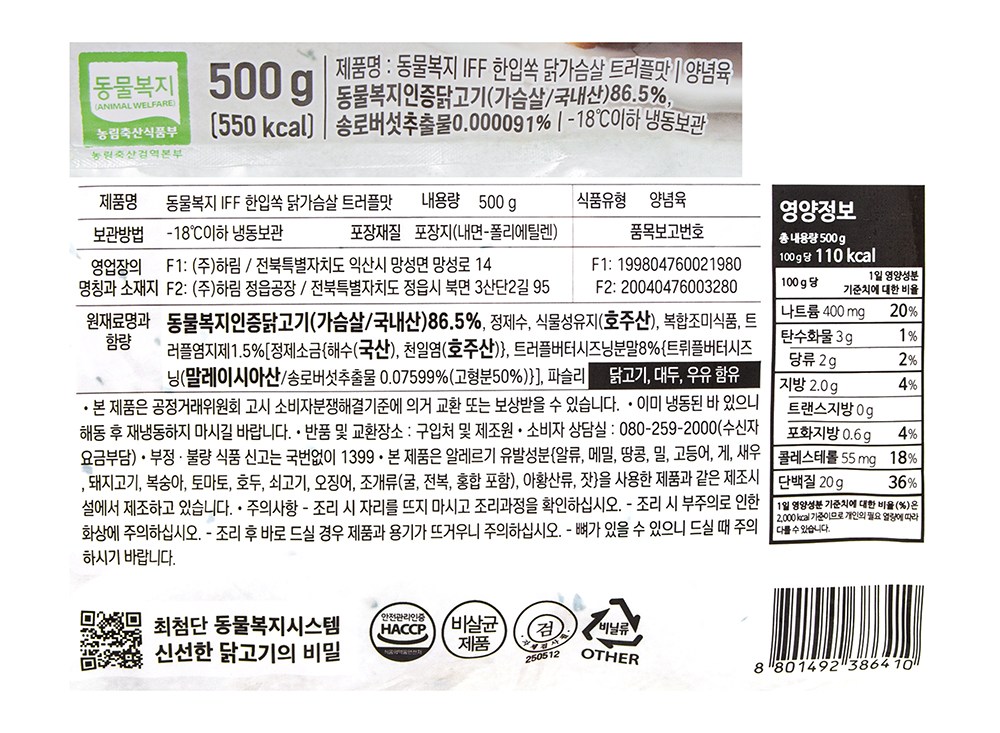 동물복지인증 닭고기를 사용한 고단백 닭가슴살이에요. 트러플버터 시즈닝을 더해 향긋한 풍미를 완성했죠. 그대로 밥반찬으로 활용하셔도 좋고, 채소 위에 올려 샐러드 토핑으로 드셔도 맛있답니다. 전자레인지, 에어프라이어로 간편하게 조리해 즐겨보세요.