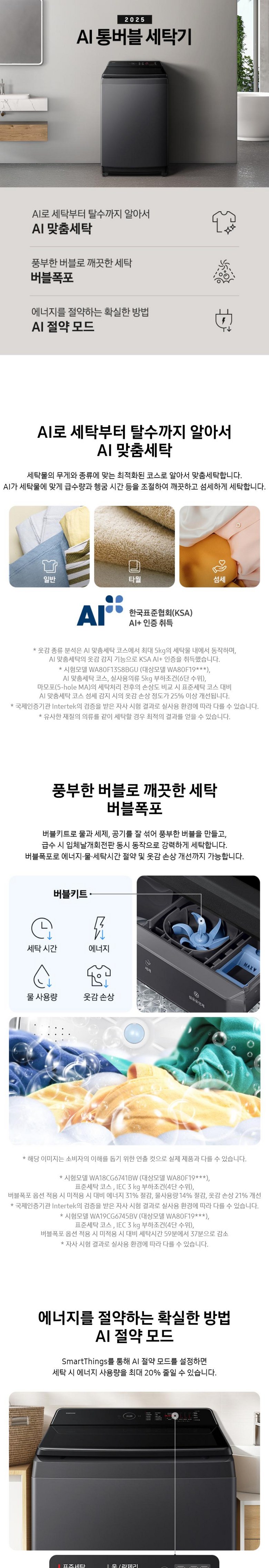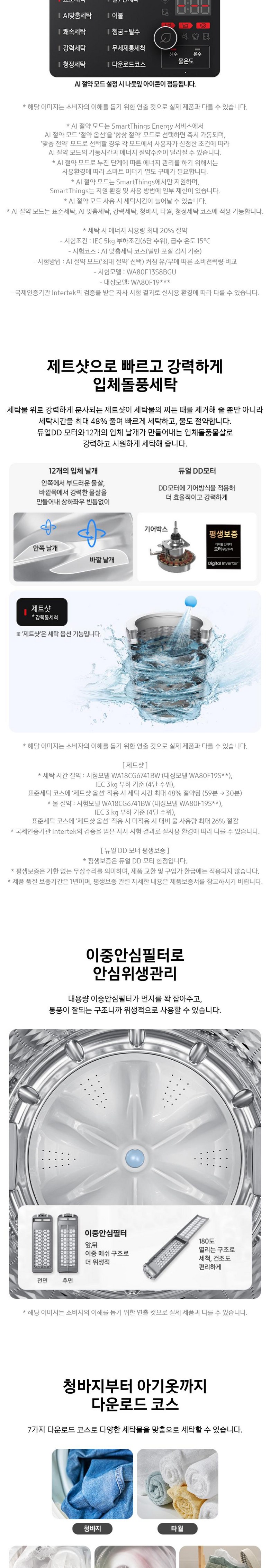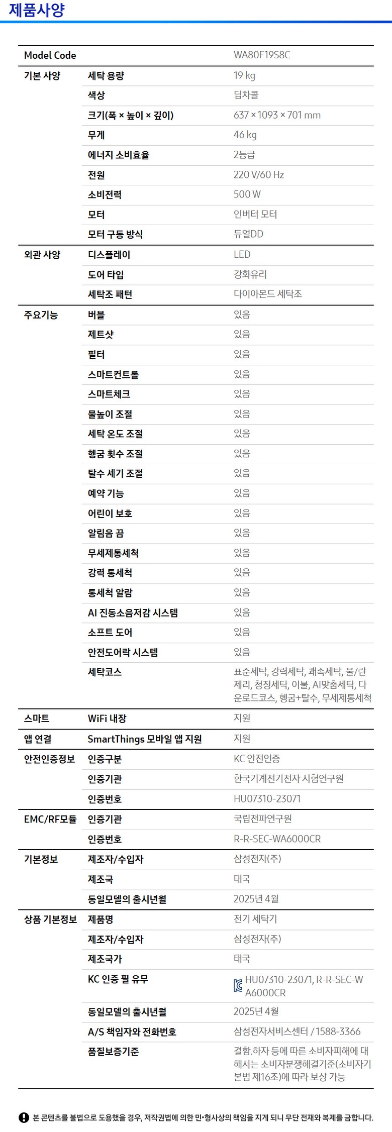 | 품명 및 모델명 | WA80F19S8C | KC 인증정보 | R-R-SEC-WA6000CR, HU07310-23071 |
