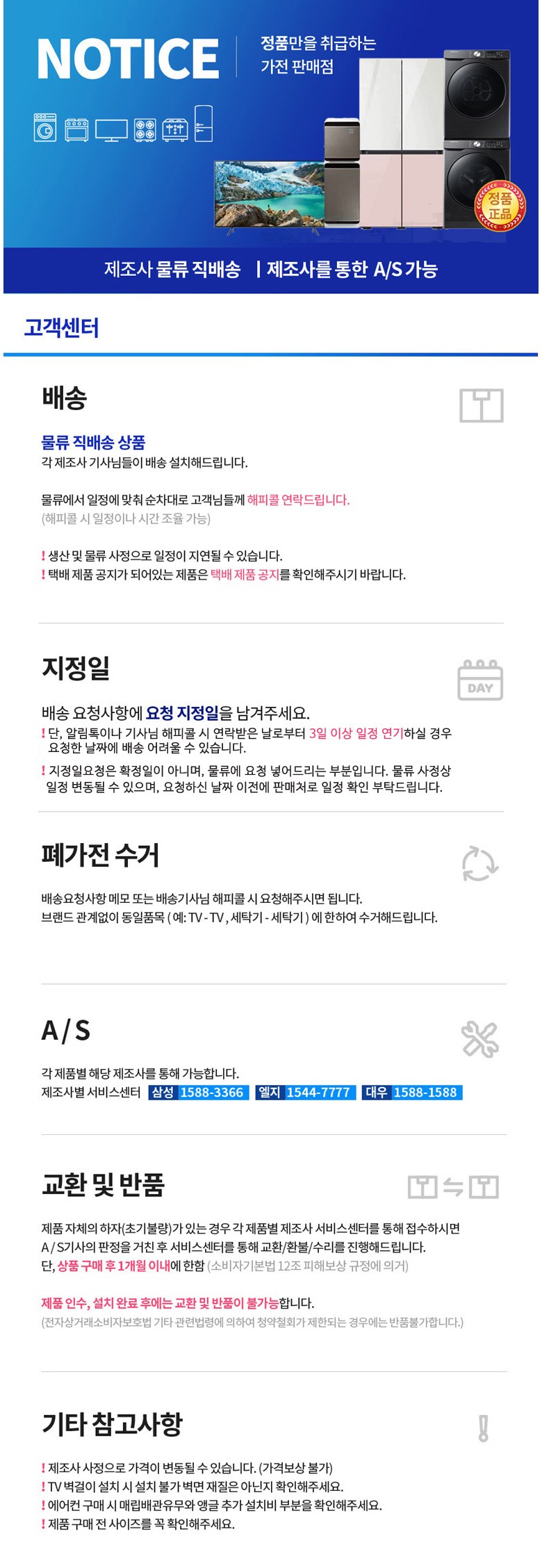 - ㆍ제조사의 사정 (신모델 출시 등) 및 부품 가격 변동 등에 의해 무료 교환/반품으로 요청하는 경우