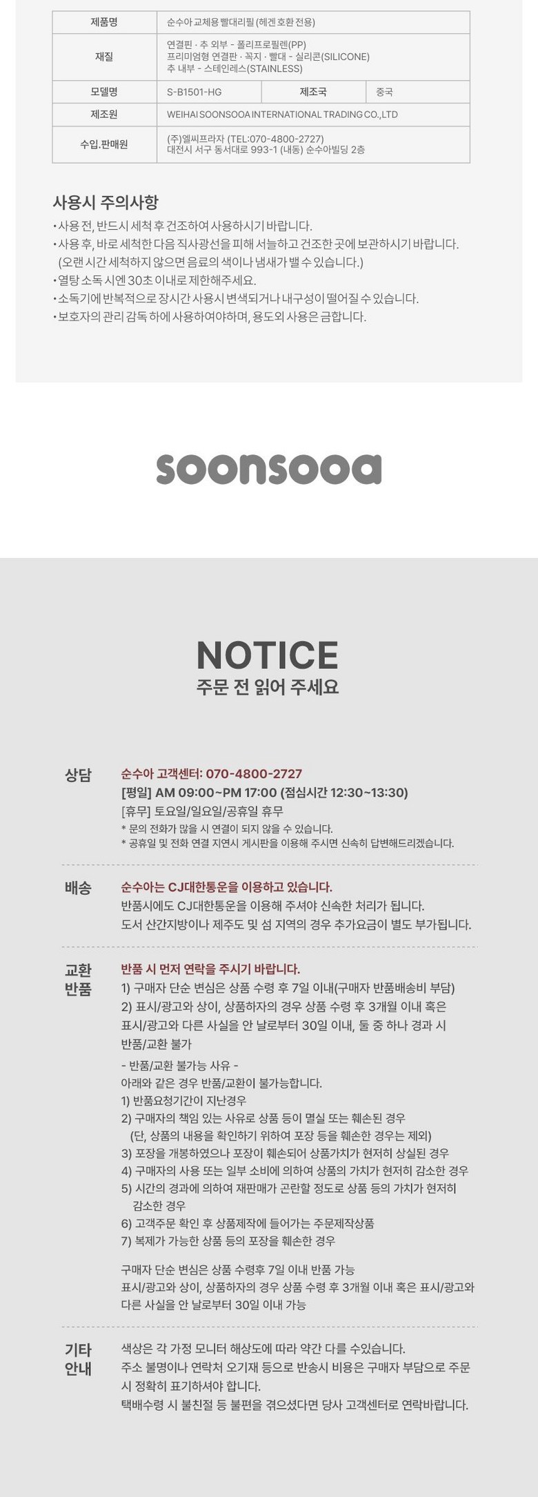 | 품명 및 모델명 | 순수아 헤겐 젖꼭지형 Y컷+추빨대 2세트 | KC 인증정보 | 상품 상세페이지 참조 |