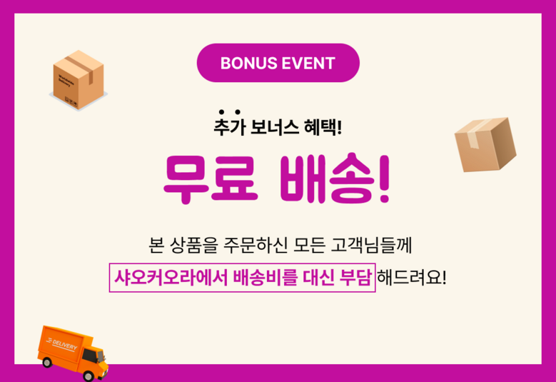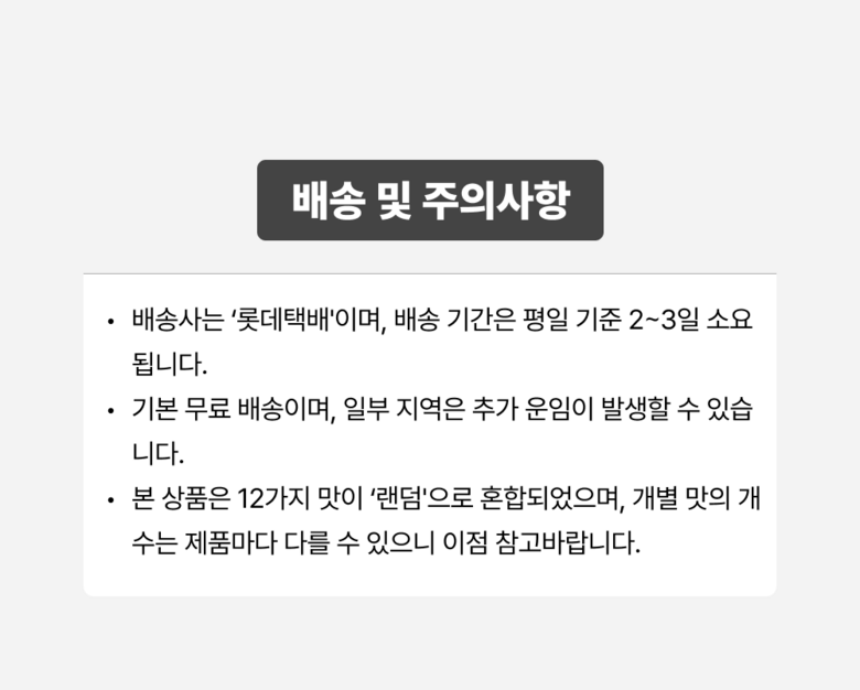 | 배송방법 | 순차배송 | 배송비 | 무료배송 · 도서산간 추가 배송비 - 제주 지역: 3,000원 - 도서산간 지역: 3,000원 |