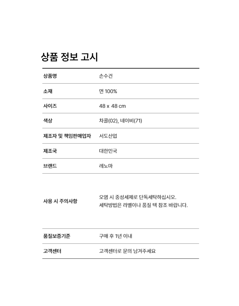 | 제조국 | 대한민국 | 취급시 주의사항 | 제품에 부착된 스티커 라벨을 참고해주세요 |
