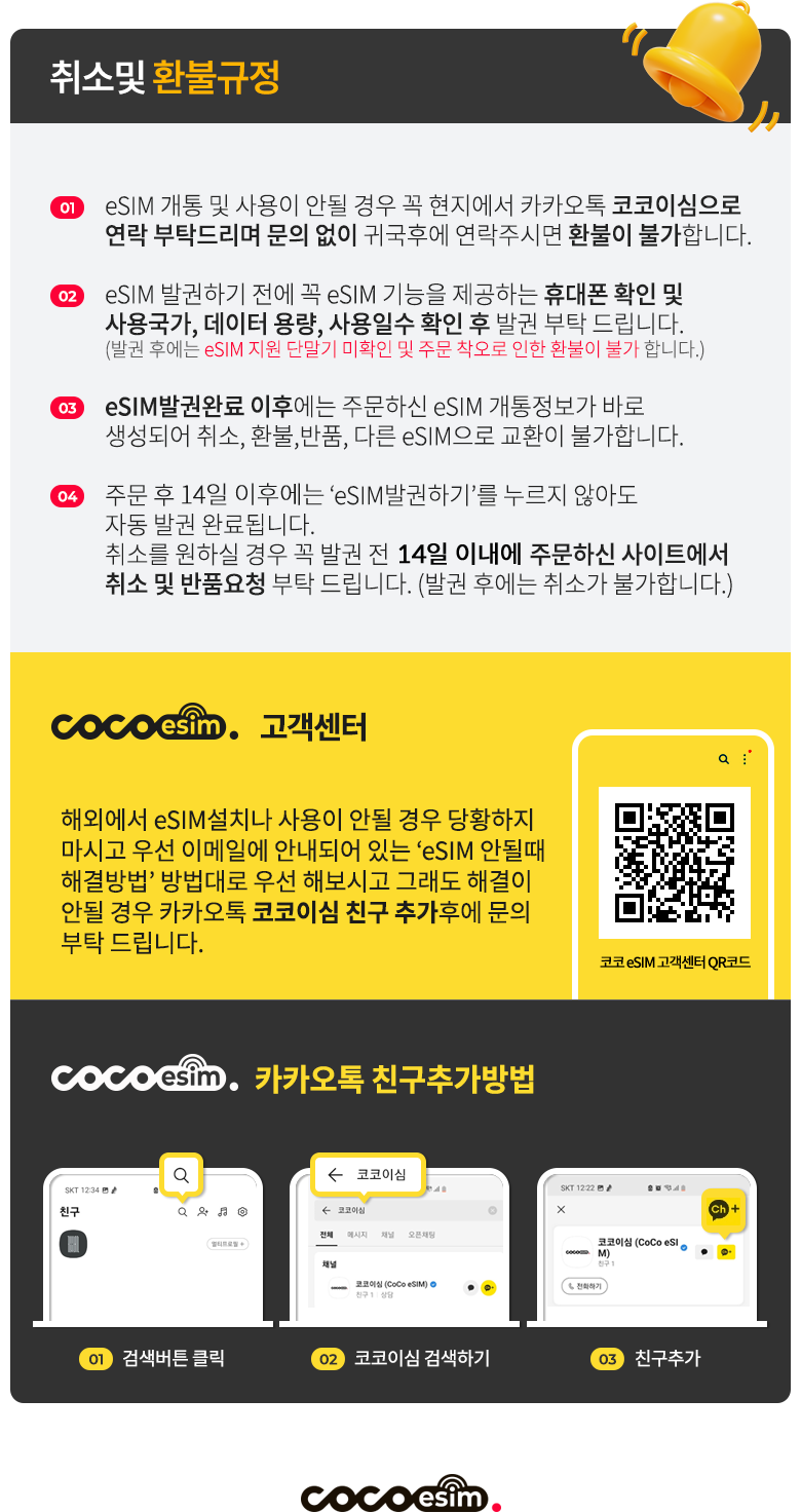 ⑧ eSIM 사용 및 등록 불가시 꼭 카카오톡 "코코이심" 채널 추가후에 연락 부탁드리며, 연락전 임의로 삭제하시거나 현지에서 문의없이 귀국 하신후에 사용불가로 연락주시면 환불이 불가합니다. (eSIM 삭제하시면 기간이 만료되어 어떠한 경우라도 재설치가 불가하여 꼭 삭제전에 연락 부탁드립니다!!)