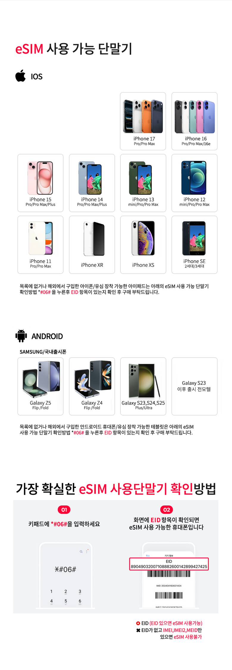⑤ eSIM 발권 완료후에 QR코드 받으시면 eSIM 사용불가 휴대폰 및 여행취소, 오주문, 미사용, 미등록, 단순변심으로 인한 반품은 불가하오니 꼭 키패드에 *#06# 누르시고 EID 항목이 있는지 확인 하신후에 구매 부탁드립니다. (EID가 없고 IMEI , IMEI2 , MEID만 있으시면 eSIM 사용 및 설치가 불가합니다)