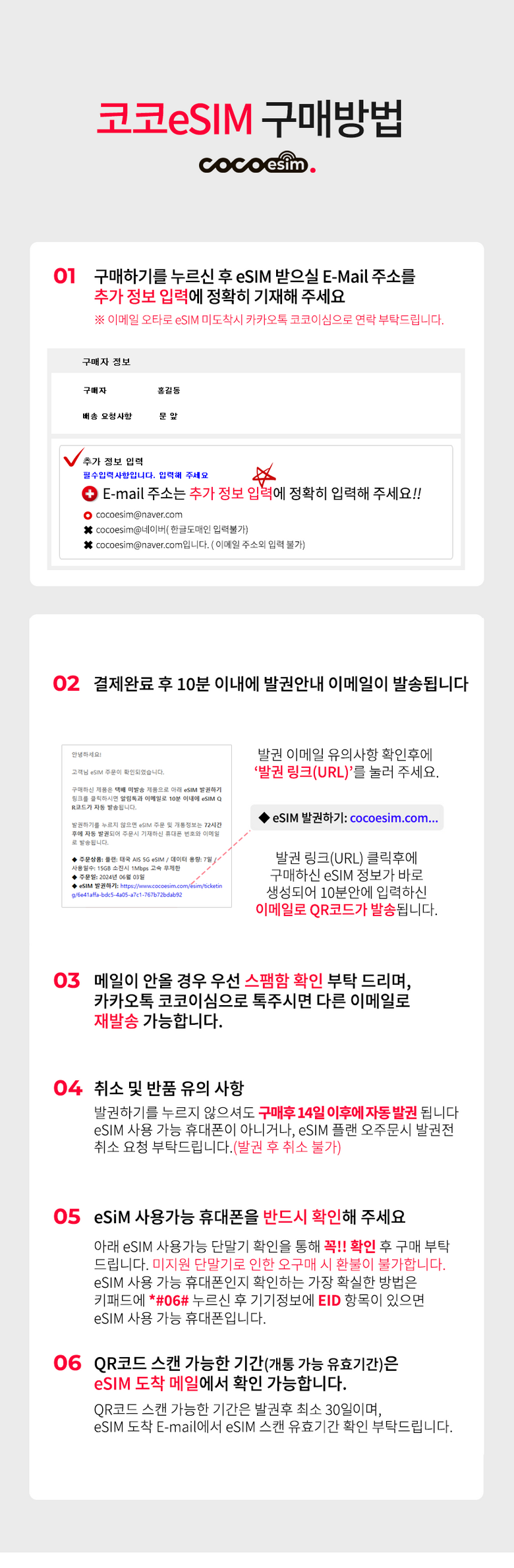 ③ 주문시 "필수 추가정보"에 이메일 주소를 2개 입력하셔도 1개의 메일 주소로만 발송되며, 영문 이메일 주소 외 중간에 띄어쓰기, 한글이나 기호,전화번호 입력시 전송 실패가 뜰수도 있습니다. (늦어도 15분~20분안에 이메일이 도착 안하면 카카오톡 "코코이심"으로 연락주시면 다른 이메일이나 카카오 알림톡으로 발송 가능합니다)