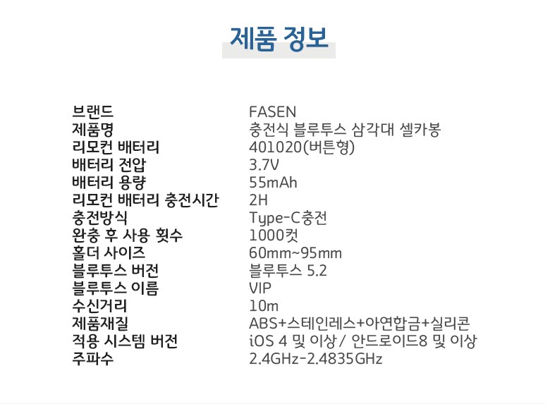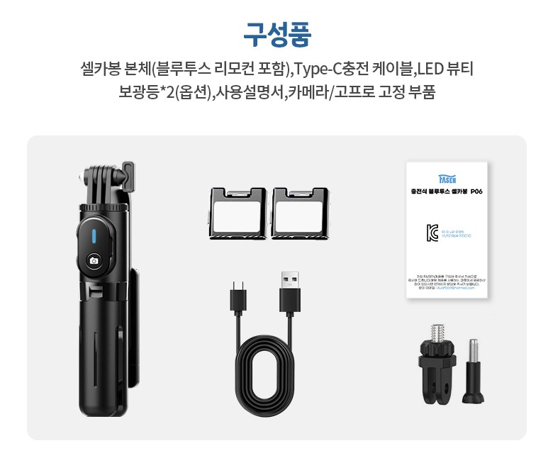 | 품명 및 모델명 | FASEN 충전식 블루투스 삼각대 셀카봉 LED 보광등 73cm | KC 인증정보 | R-R-viP-P185//YU102234-24001 |
